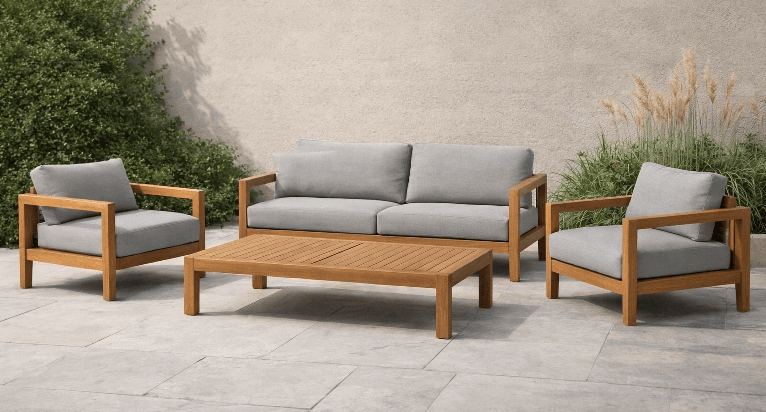 Teak Wood Outdoor Sofa Set with Grey and White Cushions